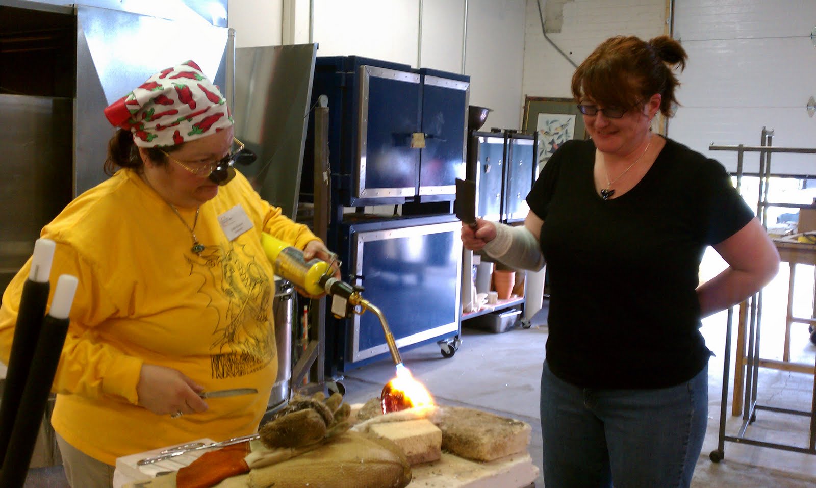 Life was good today, it doesn't get any better than friends, food, fire, fun and fondue mixed with some glass goodness? Once or twice a year a group of women and one guy from all over Michigan rent the West Michigan Glass Society for a meeting of the DiPWADS, it stands for Doesn't Play Well With Any Divas. During our day at the glass society we share ideas, melt glass and this time we had a fondue party. It was a great success and as always we could have fed half the homeless of the greater Kalamazoo area but as you know when making beads n such you need a whole lot of nourishment. Some of the women also made paperweights in the hot shop, I can't wait to get mine home on Monday. There will be photos of those to come.