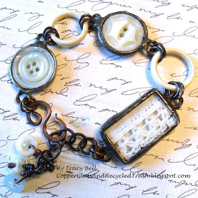 I just finished some bracelets made out of the buttons n lace pendants. I wasn't sure how they would work for a bracelet but they fit nice and the simplicity of the design works well. I think my grandma would have loved to see her button box and hankies turned into such fun items to wear.
